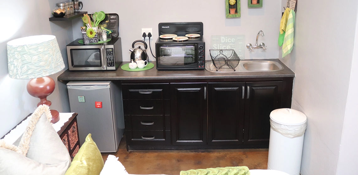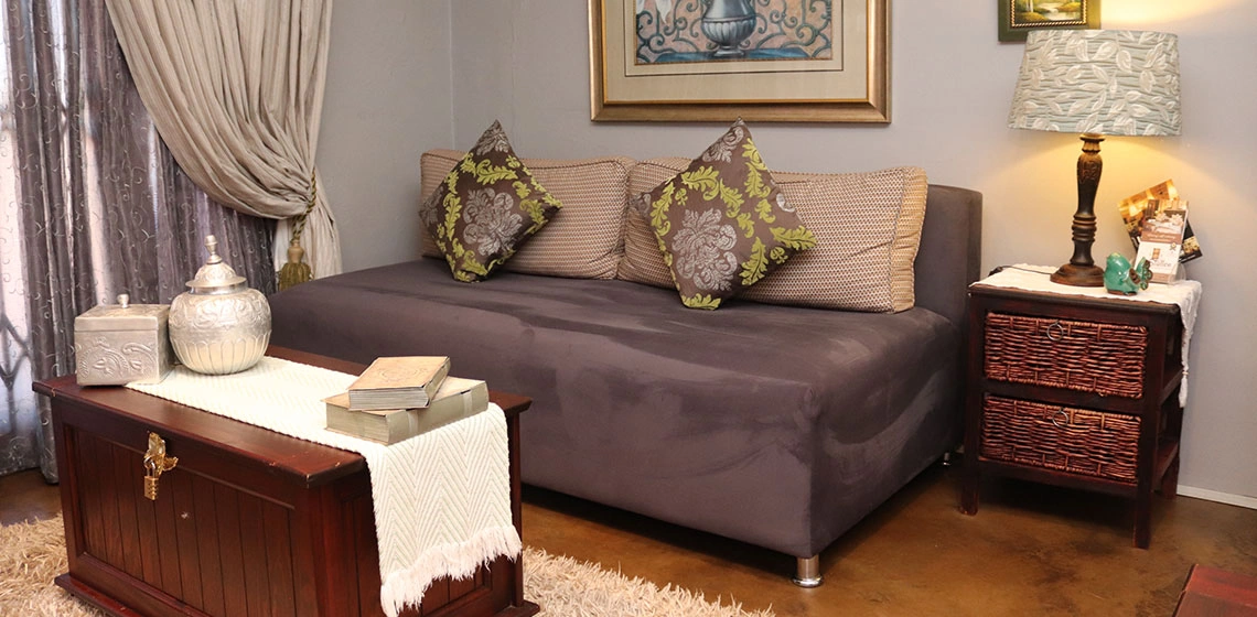 Can sleep 3 people. A spacious self-catering room with a king size bed or 2 single beds and sleeper couch, with a small semi self-catering kitchenette and bathroom with a bath / shower.