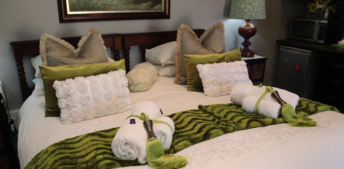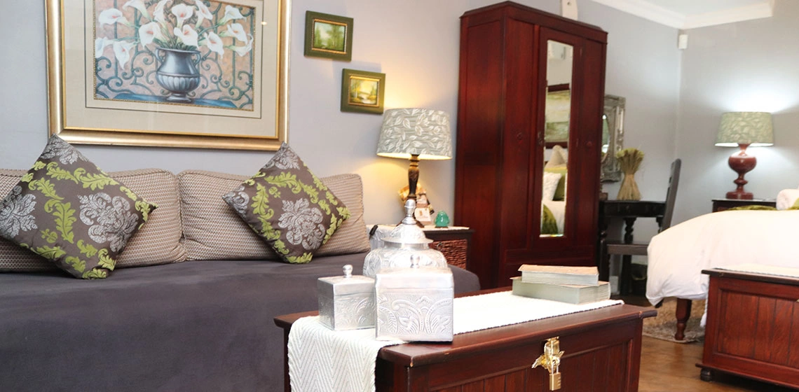 Can sleep 3 people. A spacious self-catering room with a king size bed or 2 single beds and sleeper couch, with a small semi self-catering kitchenette and bathroom with a bath / shower.
